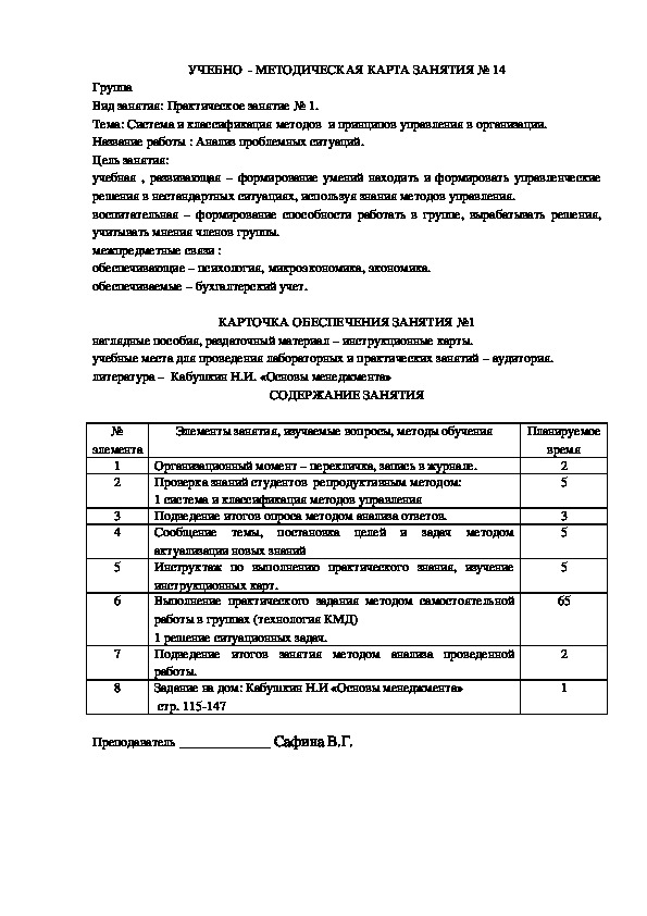 УЧЕБНО-МЕТОДИЧЕСКИЙ КОМПЛЕКС по Менеджменту разработан в соответствии с МС ИСО 9001:2008, СТ - СТОТиС 06-12 в части требований к построению, изложению, оформлению, обозначению организационными нормативными документами системы менеджмента качества. В методическом комплексе представлены рекомендации по изложению нового материала на занятиях, проверке знаний студентов, закреплению полученных знаний, формированию и развитию умений и навыков самостоятельной и коллективной деятельности на практических занятиях с применением на этих занятиях технологии «Коллективная мыслительная деятельность».
