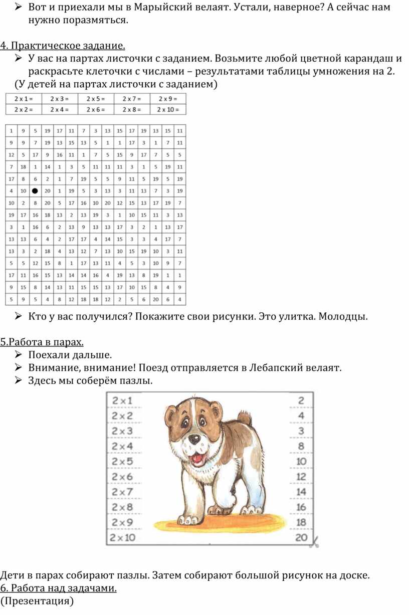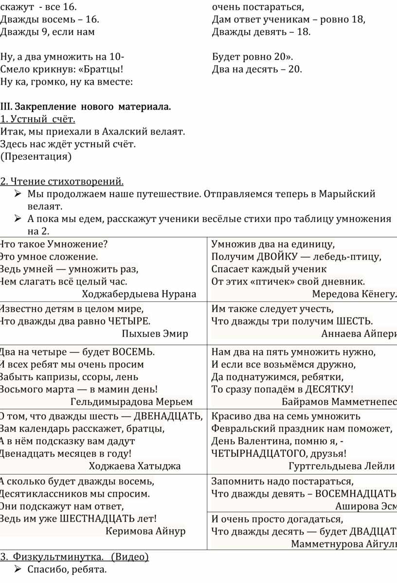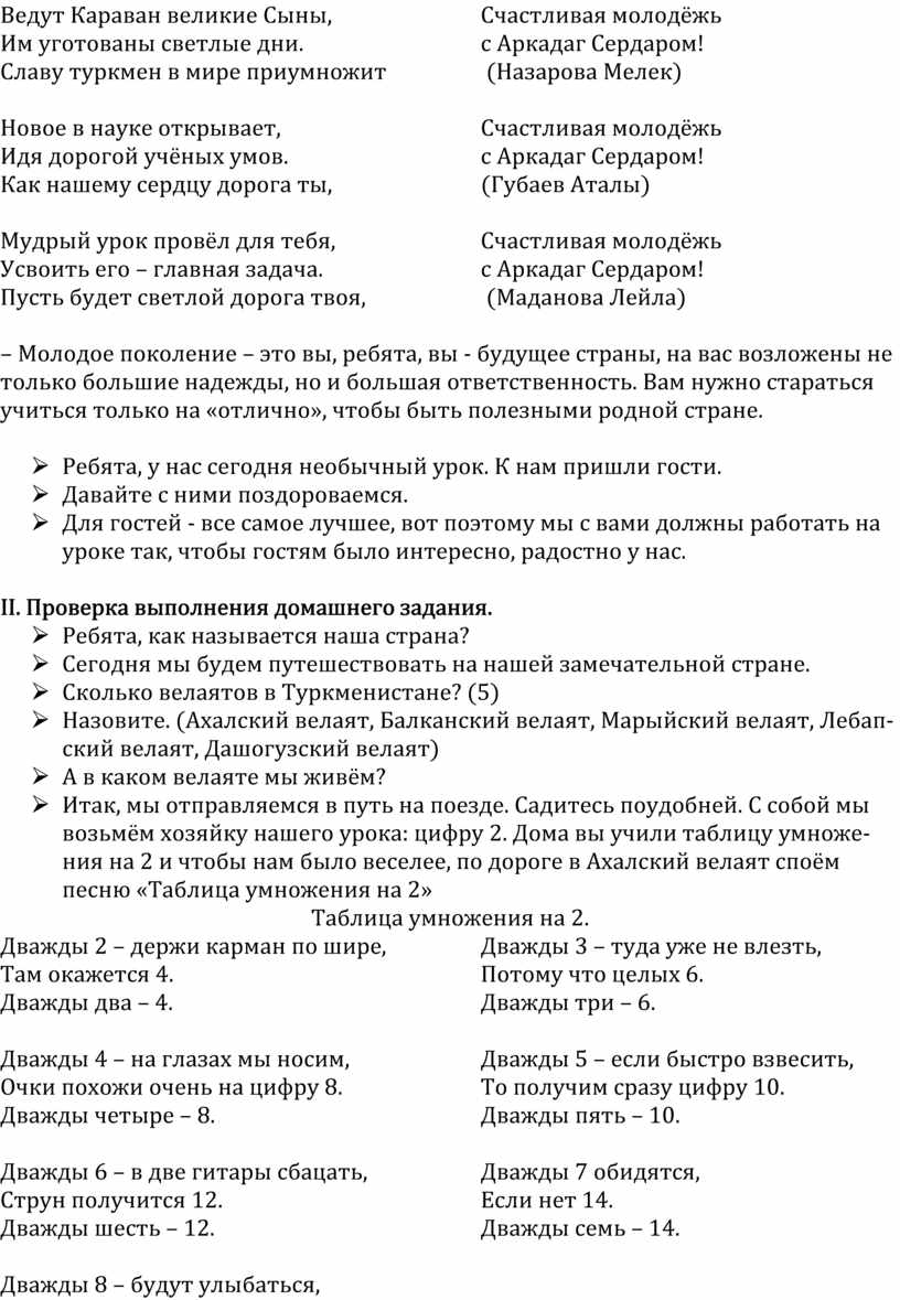 Ø Итак, мы отправляемся в путь на поезде. Садитесь поудобней. С собой мы возьмём хозяйку нашего урока: цифру 2. Дома вы учили таблицу умноже-ния на 2 и чтобы нам было веселее, по дороге в Ахалский велаят споём песню «Таблица умножения на 2»