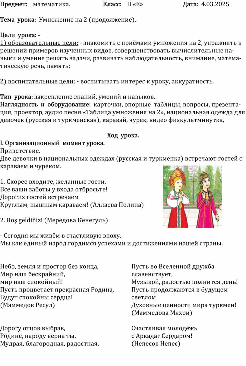 Наглядность и оборудование: карточки, опорные таблицы, вопросы, презента-ция, проектор, аудио песня «Таблица умножения на 2», национальная одежда для девочек (русская и туркменская), каравай, чурек, видео физкультминутка,