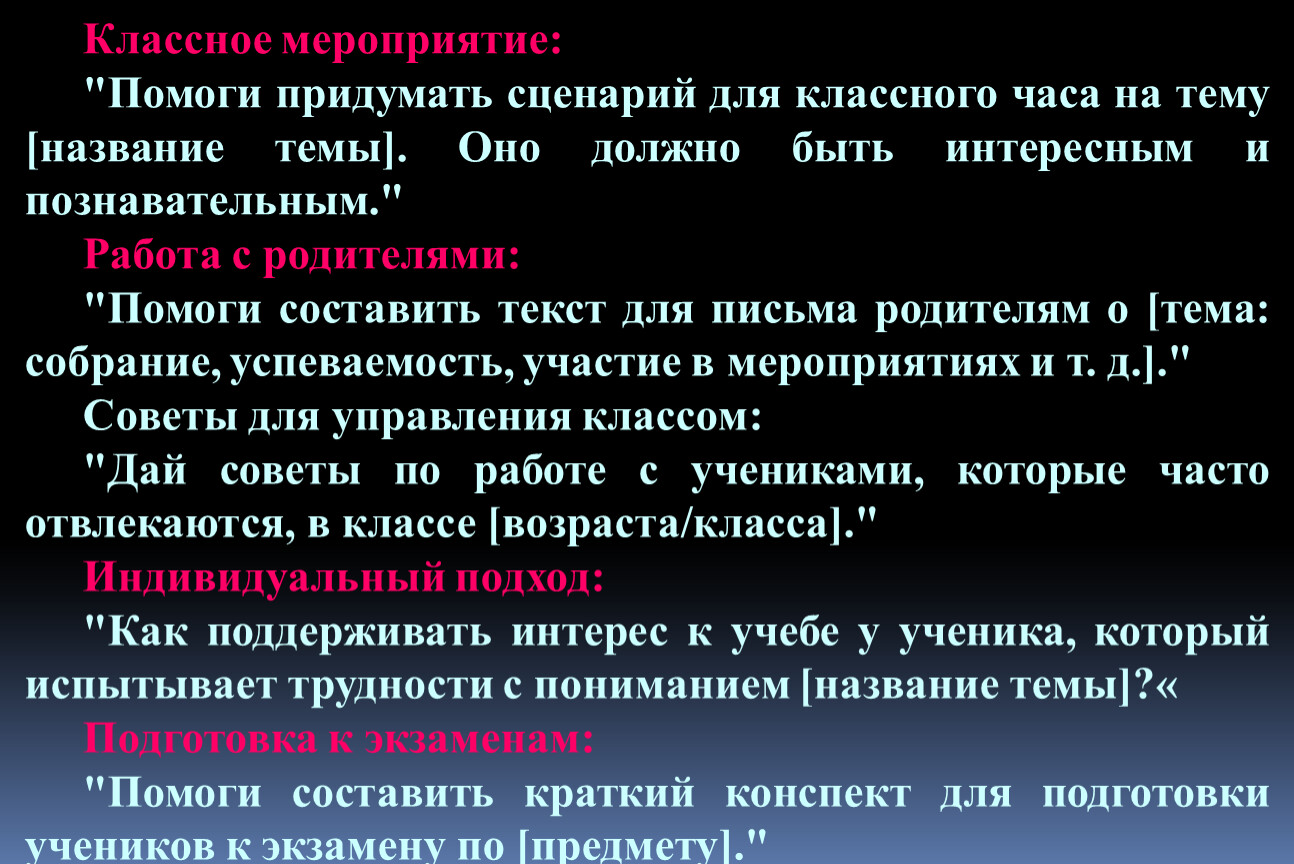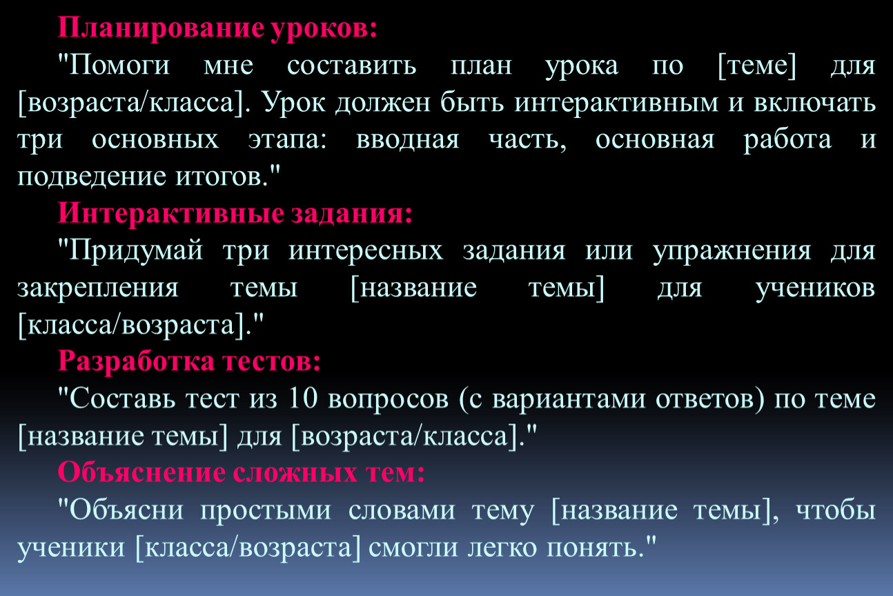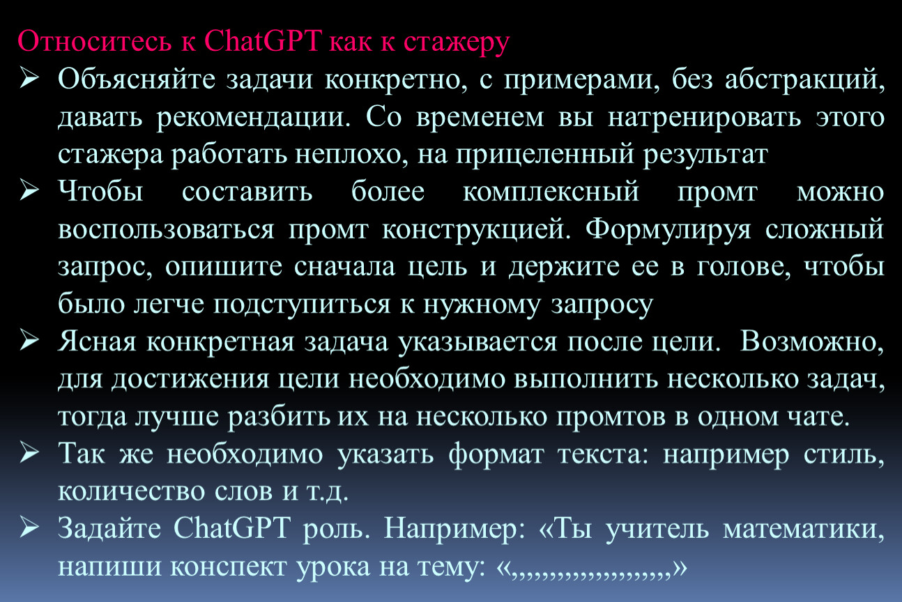 Задайте ChatGPT роль. Например: «Ты учитель математики, напиши конспект урока на тему: «,,,,,,,,,,,,,,,,,,,,,»