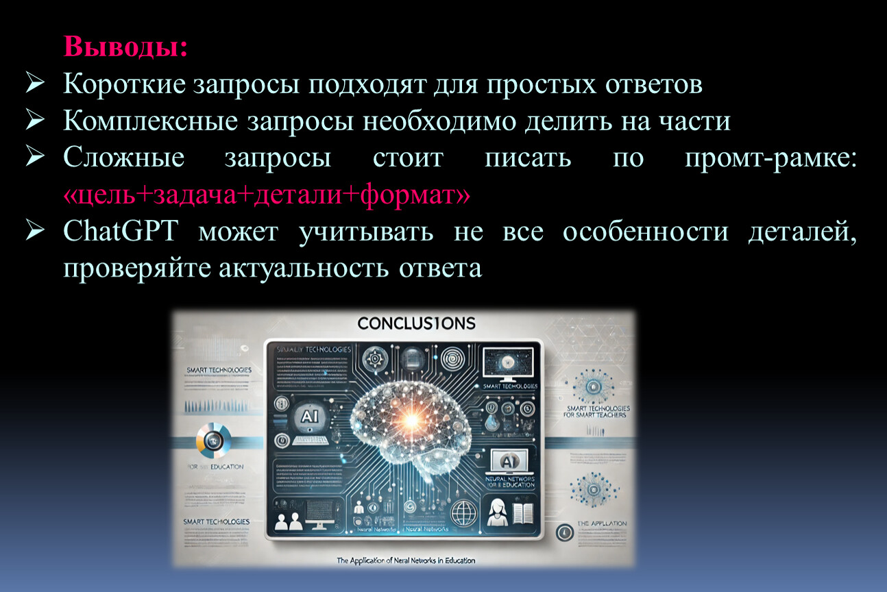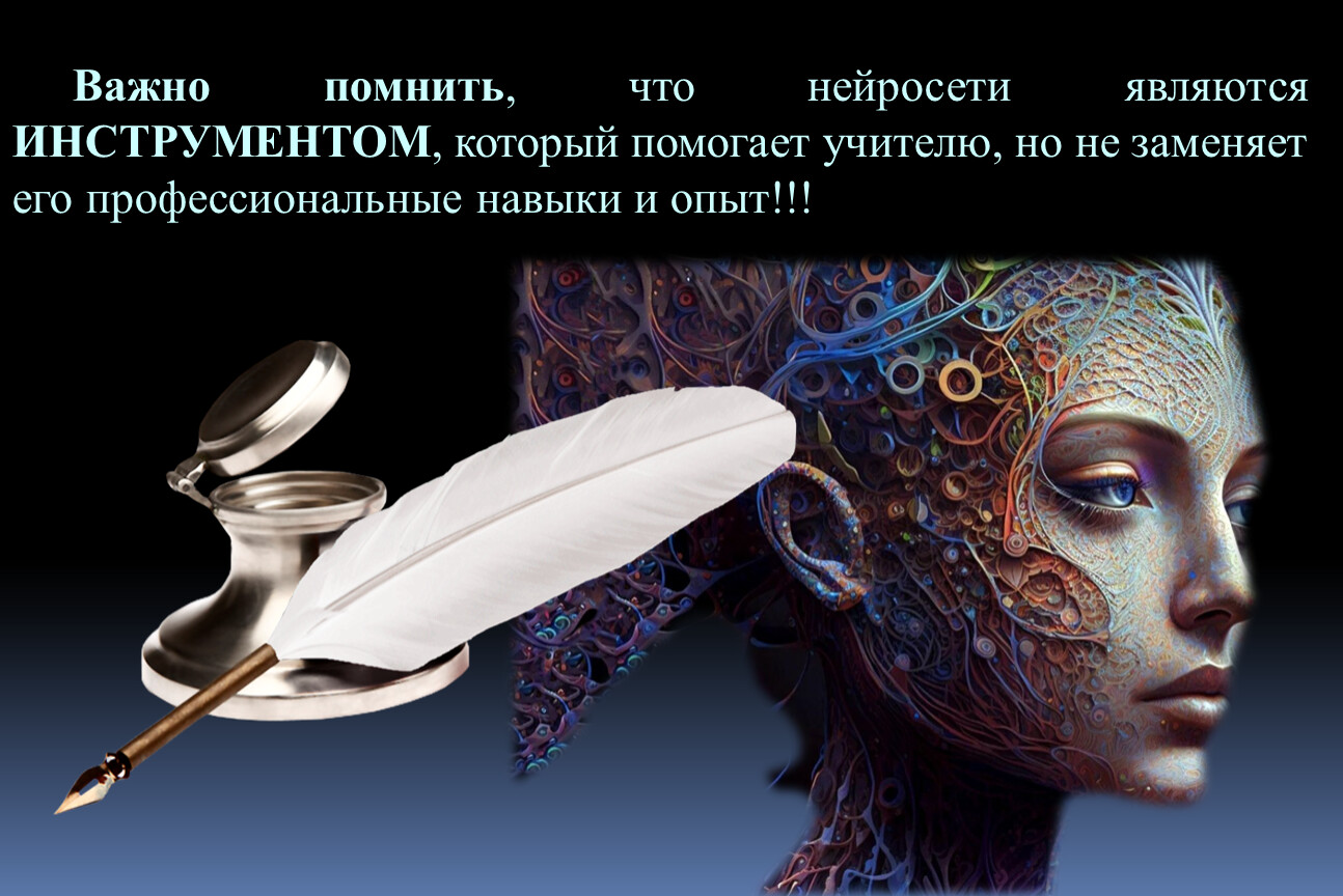 Важно помнить, что нейросети являются ИНСТРУМЕНТОМ, который помогает учителю, но не заменяет его профессиональные навыки и опыт!!!