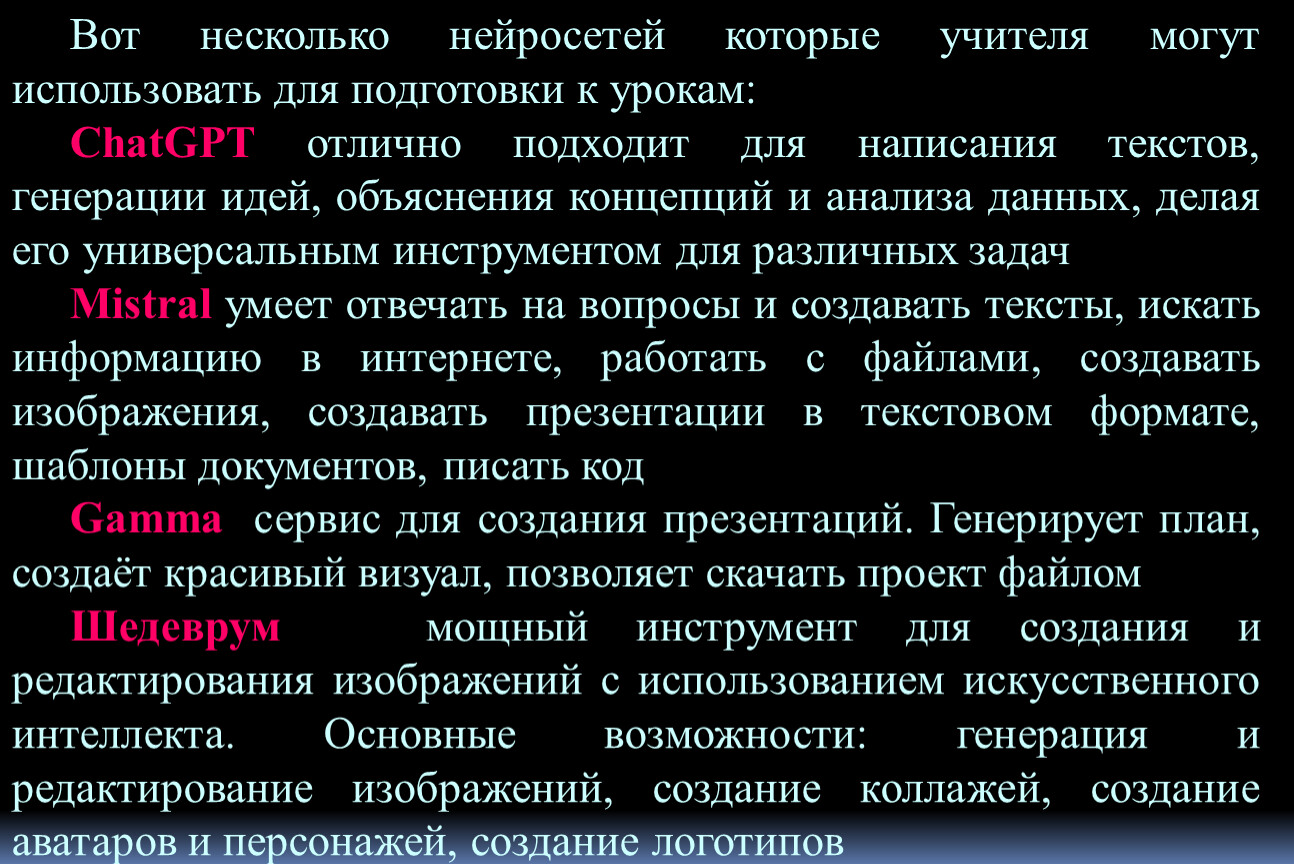 Вот несколько нейросетей которые учителя могут использовать для подготовки к урокам: