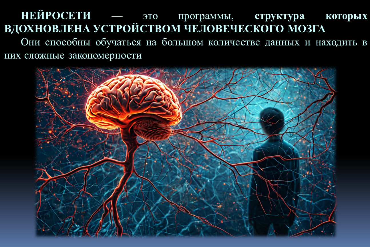 НЕЙРОСЕТИ — это программы, структура которых ВДОХНОВЛЕНА УСТРОЙСТВОМ ЧЕЛОВЕЧЕСКОГО МОЗГА
