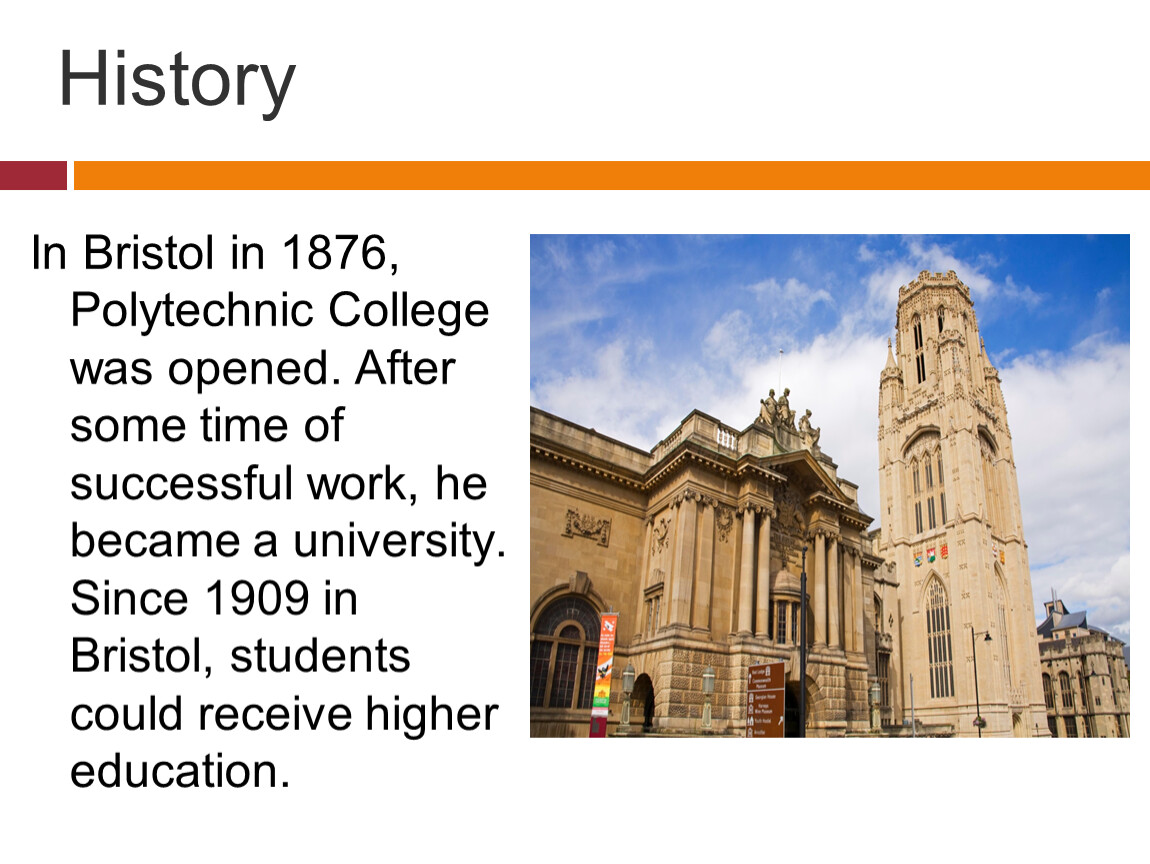 In Bristol in 1876, Polytechnic College was opened. After some time of successful work, he became a university. Since 1909 in Bristol, students could receive higher education.