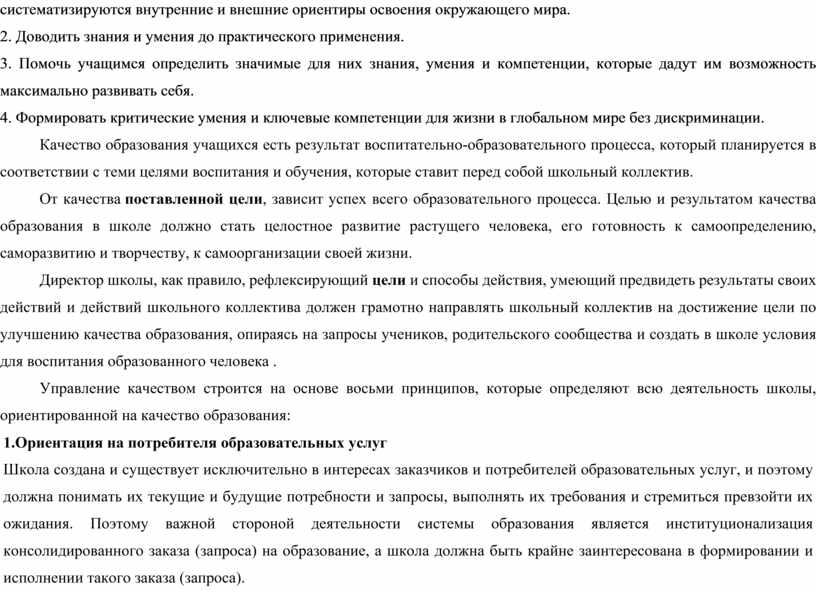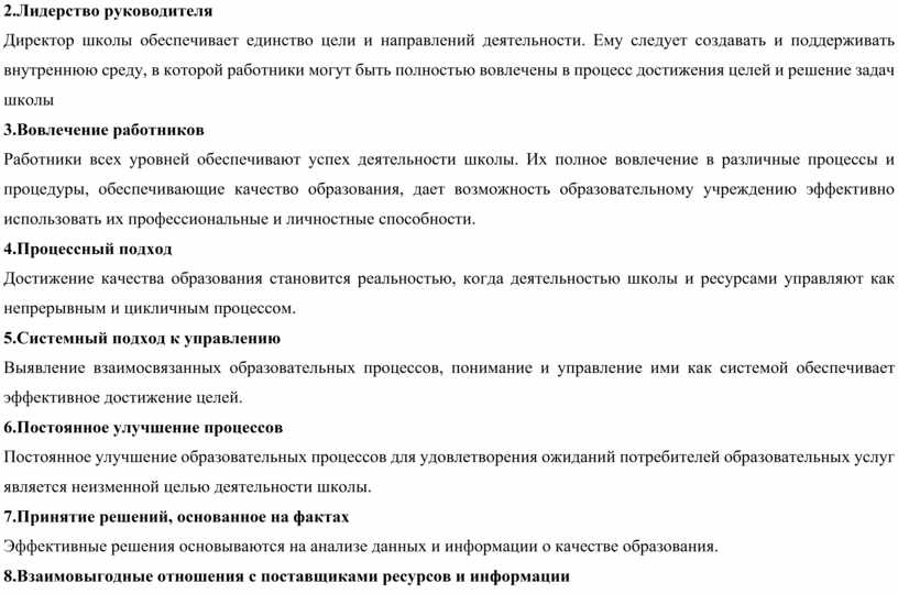 Управление качеством строится на основе восьми принципов, которые определяют всю деятельность школы, ориентированной на качество образования: