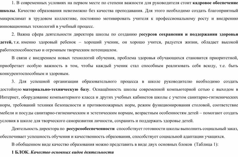 1. В современных условиях на первом месте по степени важности для руководителя стоит кадровое обеспечение школы. Качество образования невозможно без качества преподавания. Для этого необходимо создать благоприятный микроклимат в трудовом коллективе, постоянно мотивировать учителя к профессиональному росту и внедрению инновационных технологий в учебный процесс.