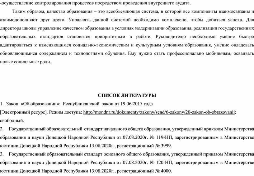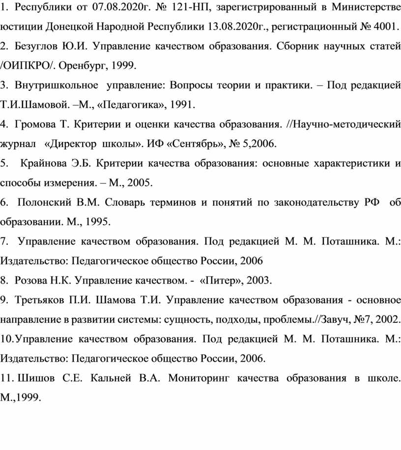 5. Безуглов Ю.И. Управление качеством образования. Сборник научных статей /ОИПКРО/. Оренбург, 1999.