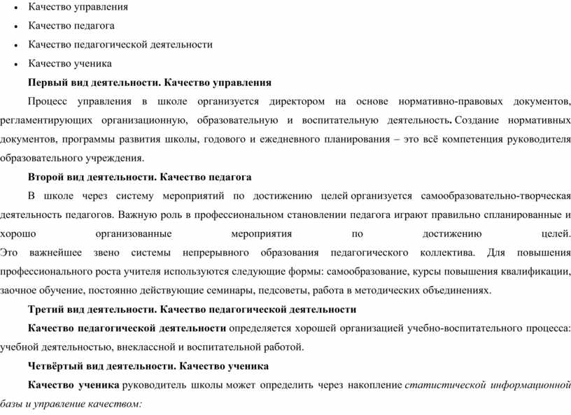 Качество педагогической деятельности определяется хорошей организацией учебно-воспитательного процесса: учебной деятельностью, внеклассной и воспитательной работой.