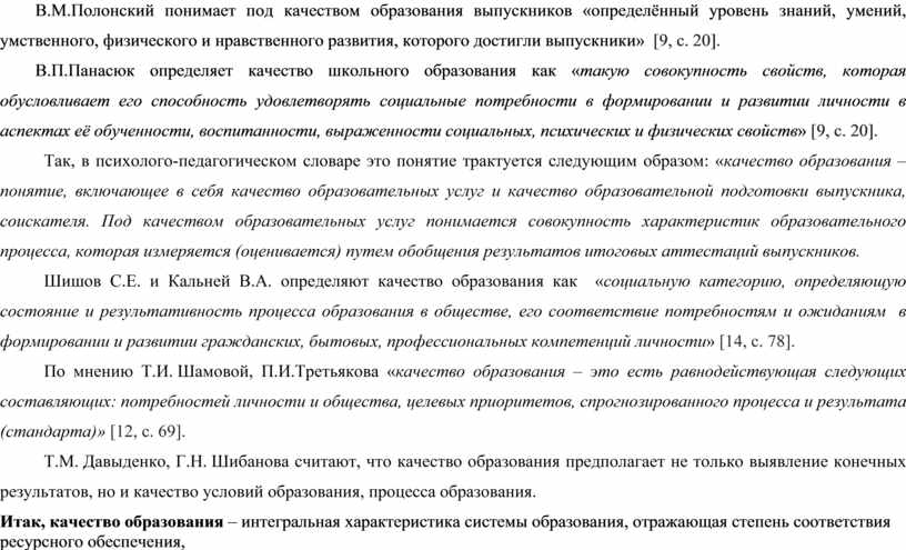 В.М.Полонский понимает под качеством образования выпускников «определённый уровень знаний, умений, умственного, физического и нравственного развития, которого достигли выпускники» [9, с. 20].