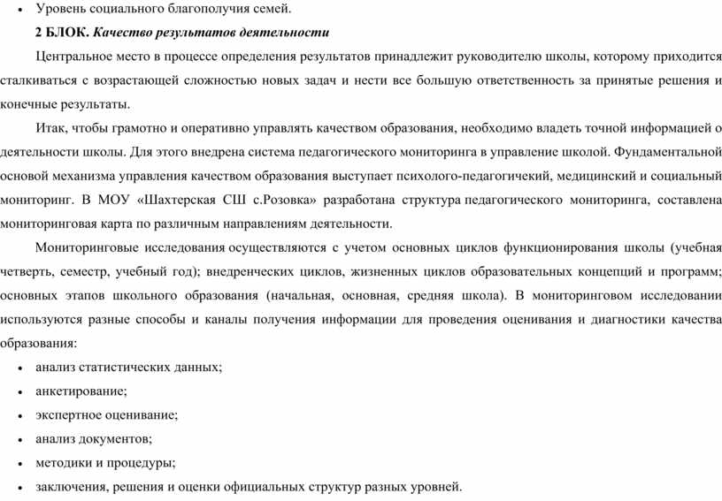 Итак, чтобы грамотно и оперативно управлять качеством образования, необходимо владеть точной информацией о деятельности школы. Для этого внедрена система педагогического мониторинга в управление школой. Фундаментальной основой механизма управления качеством образования выступает психолого-педагогичекий, медицинский и социальный мониторинг. В МОУ «Шахтерская СШ с.Розовка» разработана структура педагогического мониторинга, составлена мониторинговая карта по различным направлениям деятельности.