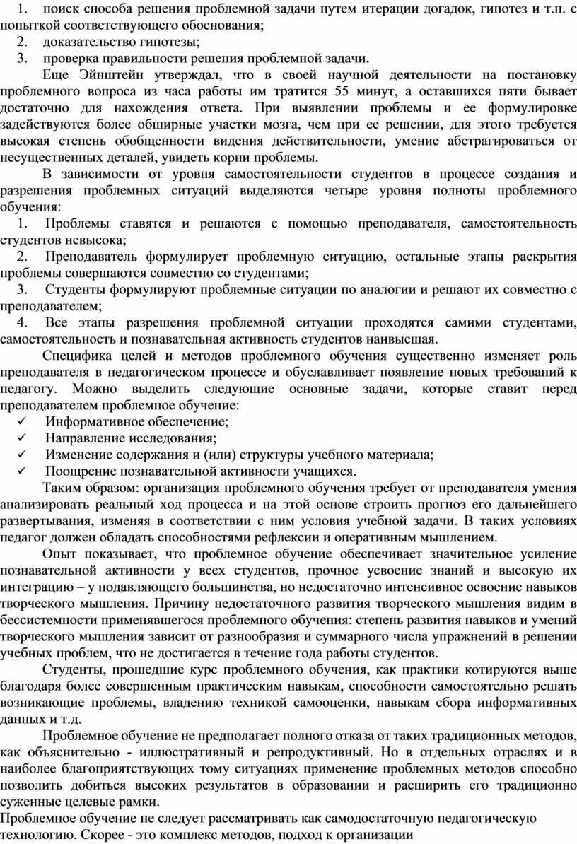 Проблемное обучение не предполагает полного отказа от таких традиционных методов, как объяснительно - иллюстративный и репродуктивный. Но в отдельных отраслях и в наиболее благоприятствующих тому ситуациях применение проблемных методов способно позволить добиться высоких результатов в образовании и расширить его традиционно суженные целевые рамки.