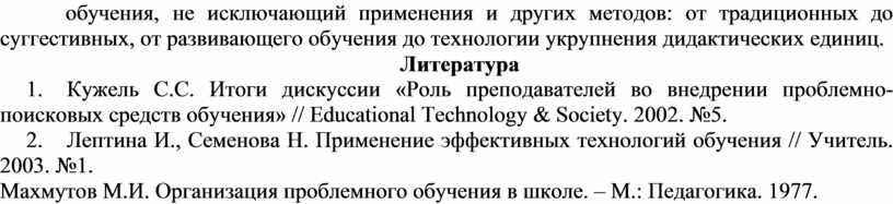 1. Кужель С.С. Итоги дискуссии «Роль преподавателей во внедрении проблемно-поисковых средств обучения» // Educational Technology & Society. 2002. №5.