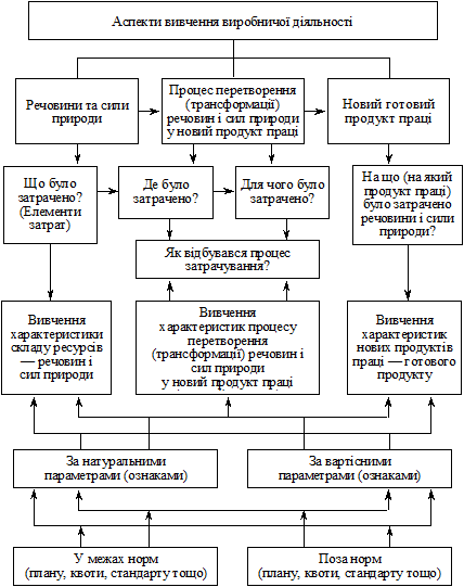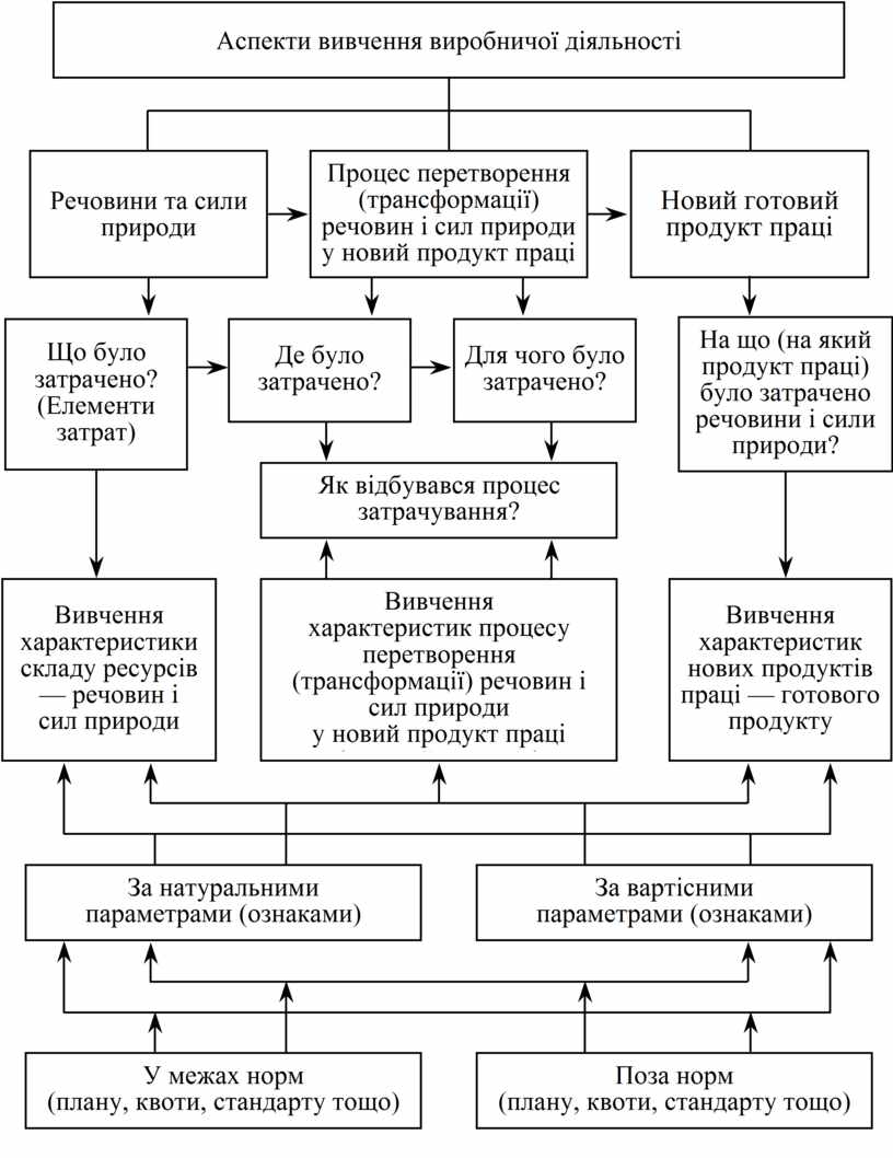 Отже, з даних бухгалтерського обліку має бути видно: скільки яких ресурсів було затрачено на виробництво, їхні натуральні та вартісні параметри, характеристика процесу перетворення (трансформації) речовин і сил природи у новий продукт праці. При цьому їх має бути достатньо, аби оцінити відповідність затрат попередньо визначеним нормам (квоті, плану тощо).