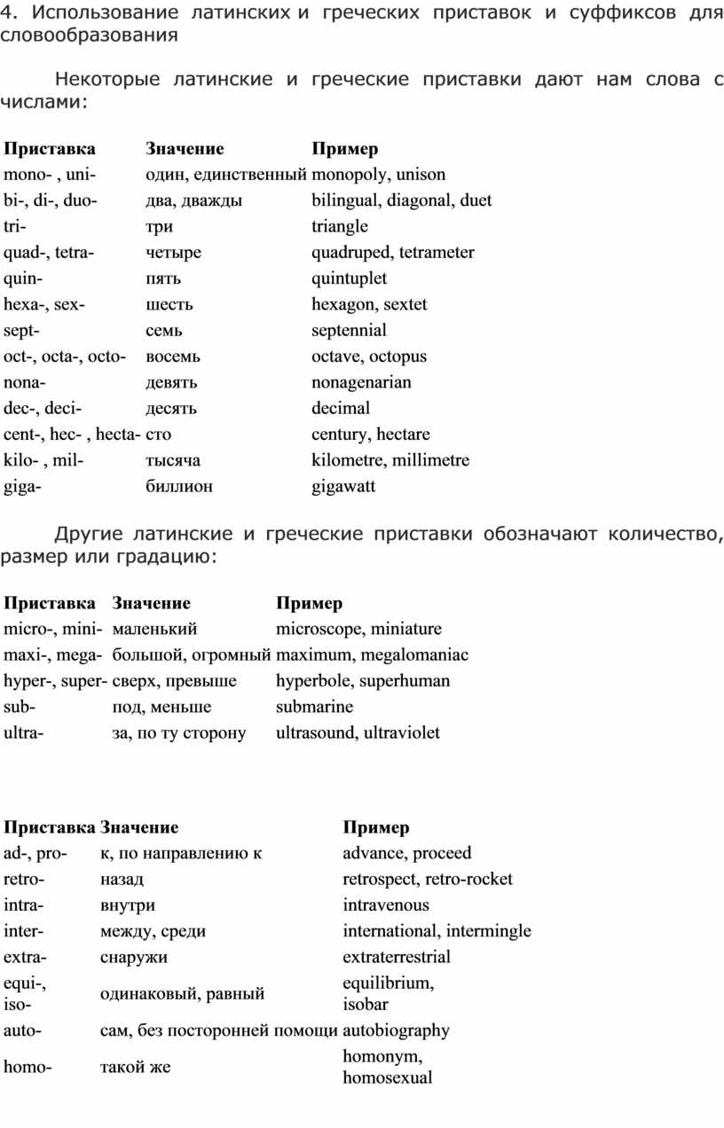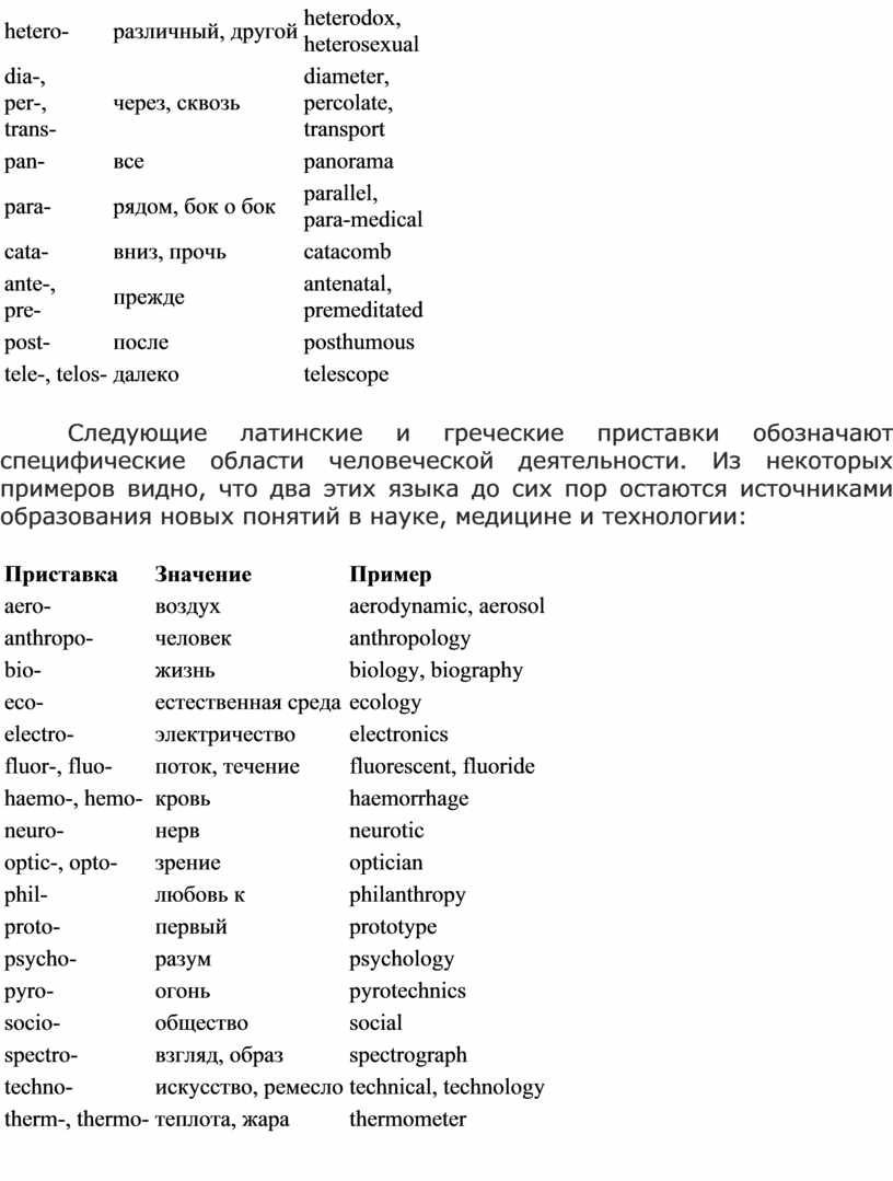 Следующие латинские и греческие приставки обозначают специфические области человеческой деятельности. Из некоторых примеров видно, что два этих языка до сих пор остаются источниками образования новых понятий в науке, медицине и технологии: