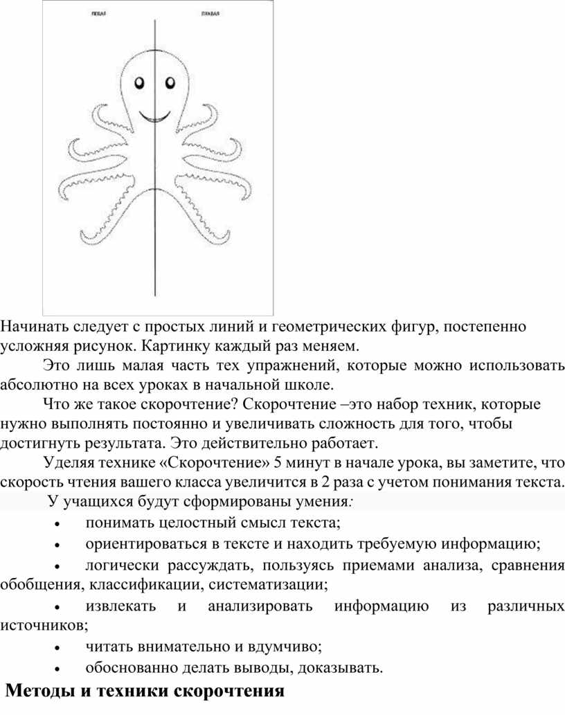 Уделяя технике «Скорочтение» 5 минут в начале урока, вы заметите, что скорость чтения вашего класса увеличится в 2 раза с учетом понимания текста.
