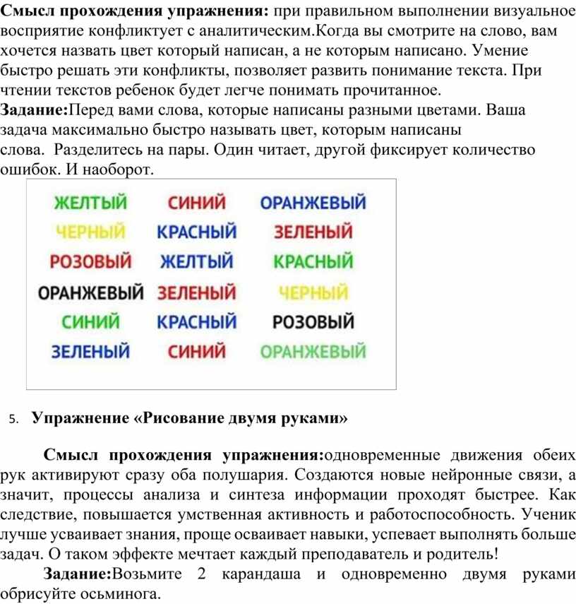 Смысл прохождения упражнения: при правильном выполнении визуальное восприятие конфликтует с аналитическим.Когда вы смотрите на слово, вам хочется назвать цвет который написан, а не которым написано. Умение быстро решать эти конфликты, позволяет развить понимание текста. При чтении текстов ребенок будет легче понимать прочитанное.