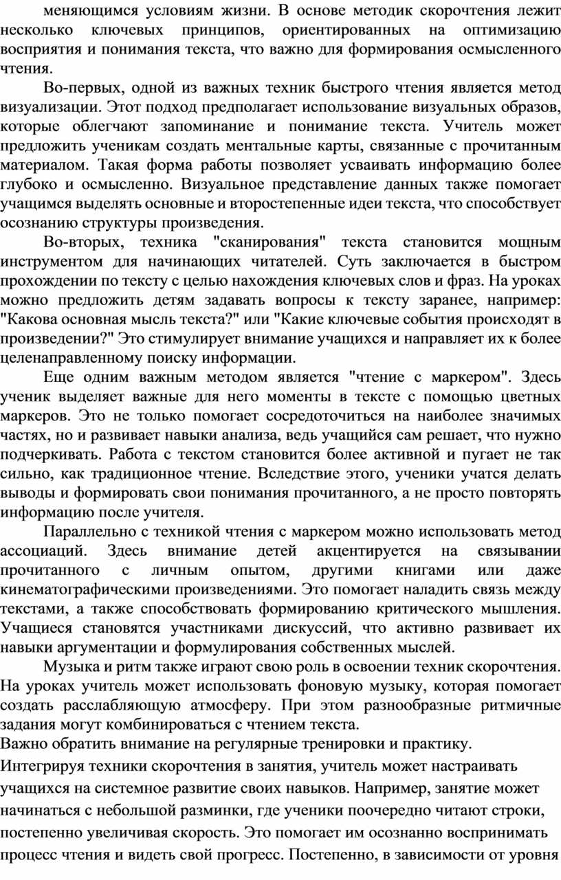 Скорочтение открывает перед обучающимися начальной школы возможности эффективного восприятия литературы и стимулирует интерес к чтению. Черты этой техники корректируют традиционные подходы к чтению, что особенно актуально для юного поколения, которое воспринимает информацию по-новому, адаптируясь к стремительно меняющимся условиям жизни. В основе методик скорочтения лежит несколько ключевых принципов, ориентированных на оптимизацию восприятия и понимания текста, что важно для формирования осмысленного чтения.