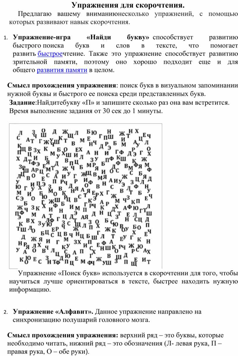 1. Упражнение-игра «Найди букву» способствует развитию быстрого поиска букв и слов в тексте, что помогает развить быстроечтение. Также это упражнение способствует развитию зрительной памяти, поэтому оно хорошо подходит еще и для общего развития памяти в целом.