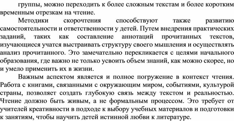 Методики скорочтения способствуют также развитию самостоятельности и ответственности у детей. Путем внедрения практических заданий, таких как составление аннотаций прочитанных текстов, изучающиеся учатся выстраивать структуру своего мышления и осуществлять анализ прочитанного. Это замечательно перекликается с целями начального образования, где важно не только усвоить объем знаний, как можно скорее, но и умело применить их в жизни.