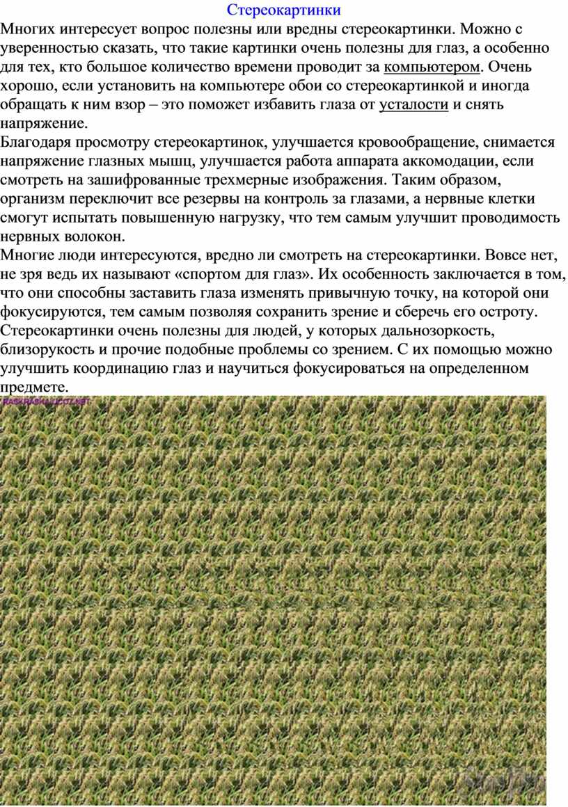 Многие люди интересуются, вредно ли смотреть на стереокартинки. Вовсе нет, не зря ведь их называют «спортом для глаз». Их особенность заключается в том, что они способны заставить глаза изменять привычную точку, на которой они фокусируются, тем самым позволяя сохранить зрение и сберечь его остроту. Стереокартинки очень полезны для людей, у которых дальнозоркость, близорукость и прочие подобные проблемы со зрением. С их помощью можно улучшить координацию глаз и научиться фокусироваться на определенном предмете.