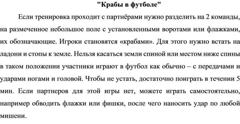 Если тренировка проходит с партнёрами нужно разделить на 2 команды, на размеченное небольшое поле с установленными воротами или флажками, их обозначающие. Игроки становятся «крабами». Для этого нужно встать на ладони и стопы к земле. Нельзя касаться земли спиной или местом ниже спины в таком положении участники играют в футбол как обычно – с передачами и ударами ногами и головой. Чтобы не устать, достаточно поиграть в течении 5 мин. Если партнеров для этой игры нет, можете играть самостоятельно, например обводить флажки или фишки, после чего наносить удар по любой мишени.