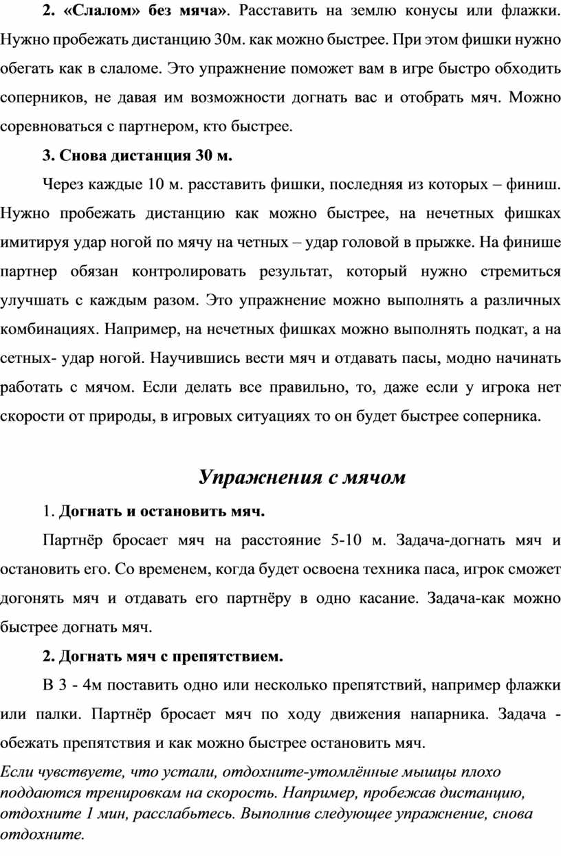 Через каждые 10 м. расставить фишки, последняя из которых – финиш. Нужно пробежать дистанцию как можно быстрее, на нечетных фишках имитируя удар ногой по мячу на четных – удар головой в прыжке. На финише партнер обязан контролировать результат, который нужно стремиться улучшать с каждым разом. Это упражнение можно выполнять а различных комбинациях. Например, на нечетных фишках можно выполнять подкат, а на сетных- удар ногой. Научившись вести мяч и отдавать пасы, модно начинать работать с мячом. Если делать все правильно, то, даже если у игрока нет скорости от природы, в игровых ситуациях то он будет быстрее соперника.