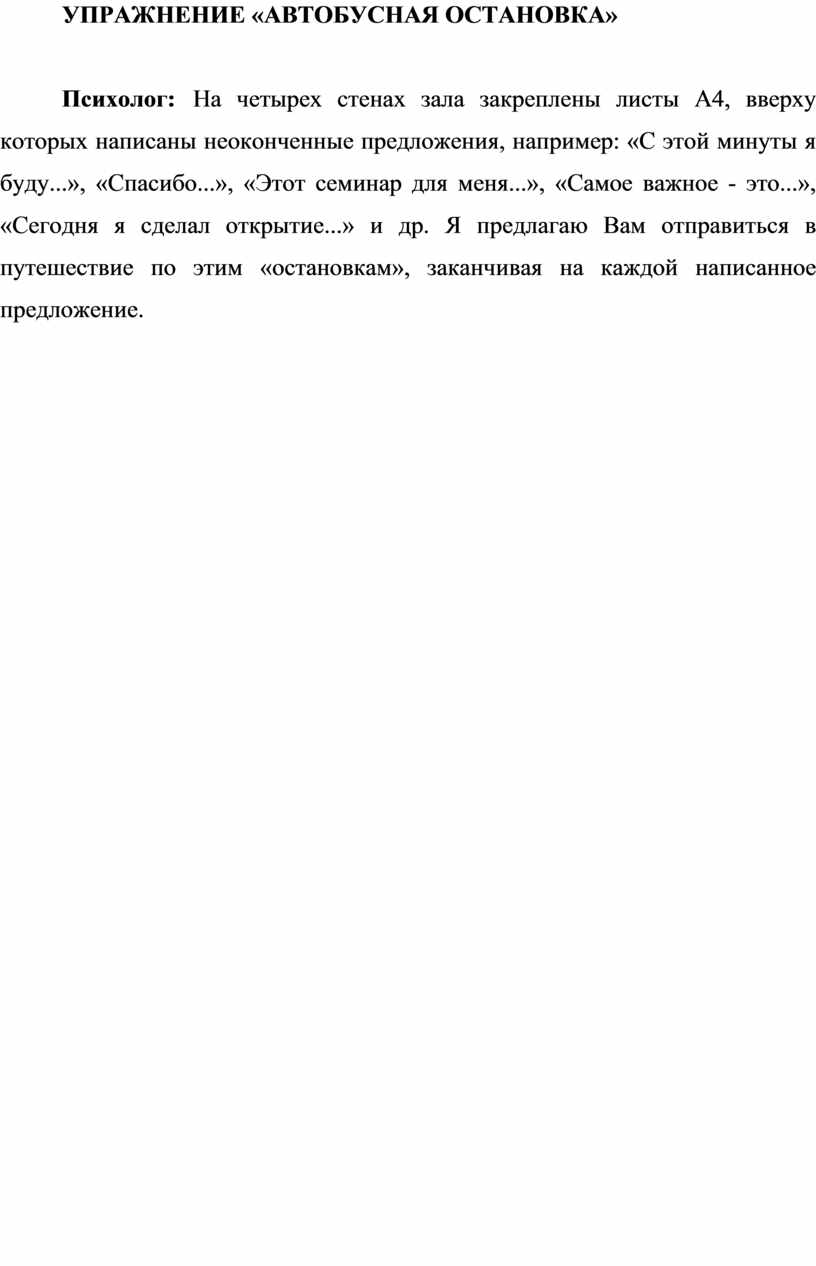 Психолог: На четырех стенах зала закреплены листы А4, вверху которых написаны неоконченные предложения, например: «С этой минуты я буду...», «Спасибо...», «Этот семинар для меня...», «Самое важное - это...», «Сегодня я сделал открытие...» и др. Я предлагаю Вам отправиться в путешествие по этим «остановкам», заканчивая на каждой написанное предложение.