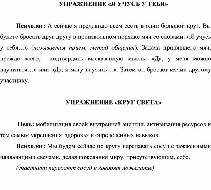 Психолог: А сейчас я предлагаю всем сесть в один большой круг. Вы будете бросать друг другу в произвольном порядке мяч со словами: «Я учусь у тебя…» (называется приём, метод общения). Задача принявшего мяч, прежде всего, подтвердить высказанную мысль: «Да, у меня можно научиться…» или «Да, я могу научить…». Затем он бросает мячик другому участнику.