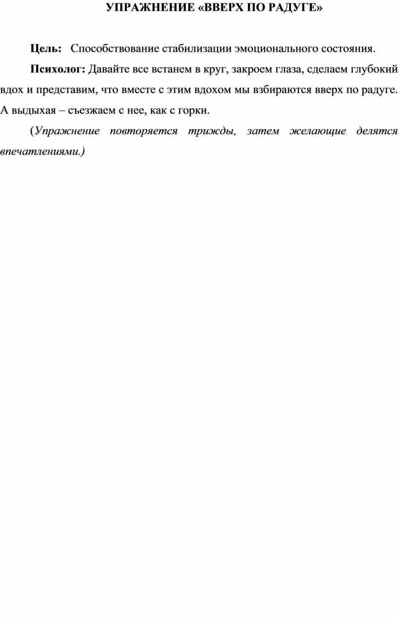 Психолог: Давайте все встанем в круг, закроем глаза, сделаем глубокий вдох и представим, что вместе с этим вдохом мы взбираются вверх по радуге. А выдыхая – съезжаем с нее, как с горки.