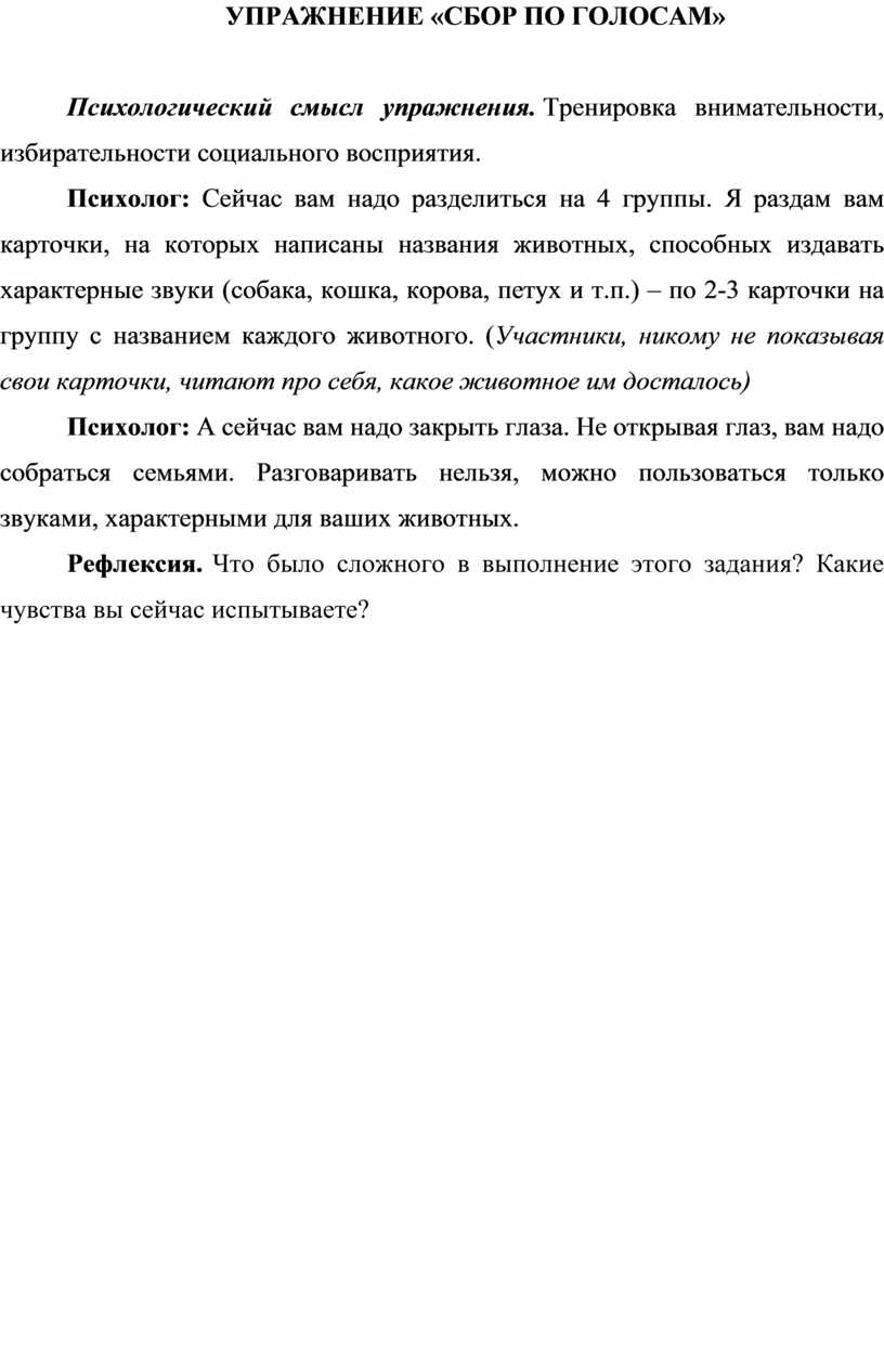 Психолог: Сейчас вам надо разделиться на 4 группы. Я раздам вам карточки, на которых написаны названия животных, способных издавать характерные звуки (собака, кошка, корова, петух и т.п.) – по 2-3 карточки на группу с названием каждого животного. (Участники, никому не показывая свои карточки, читают про себя, какое животное им досталось)