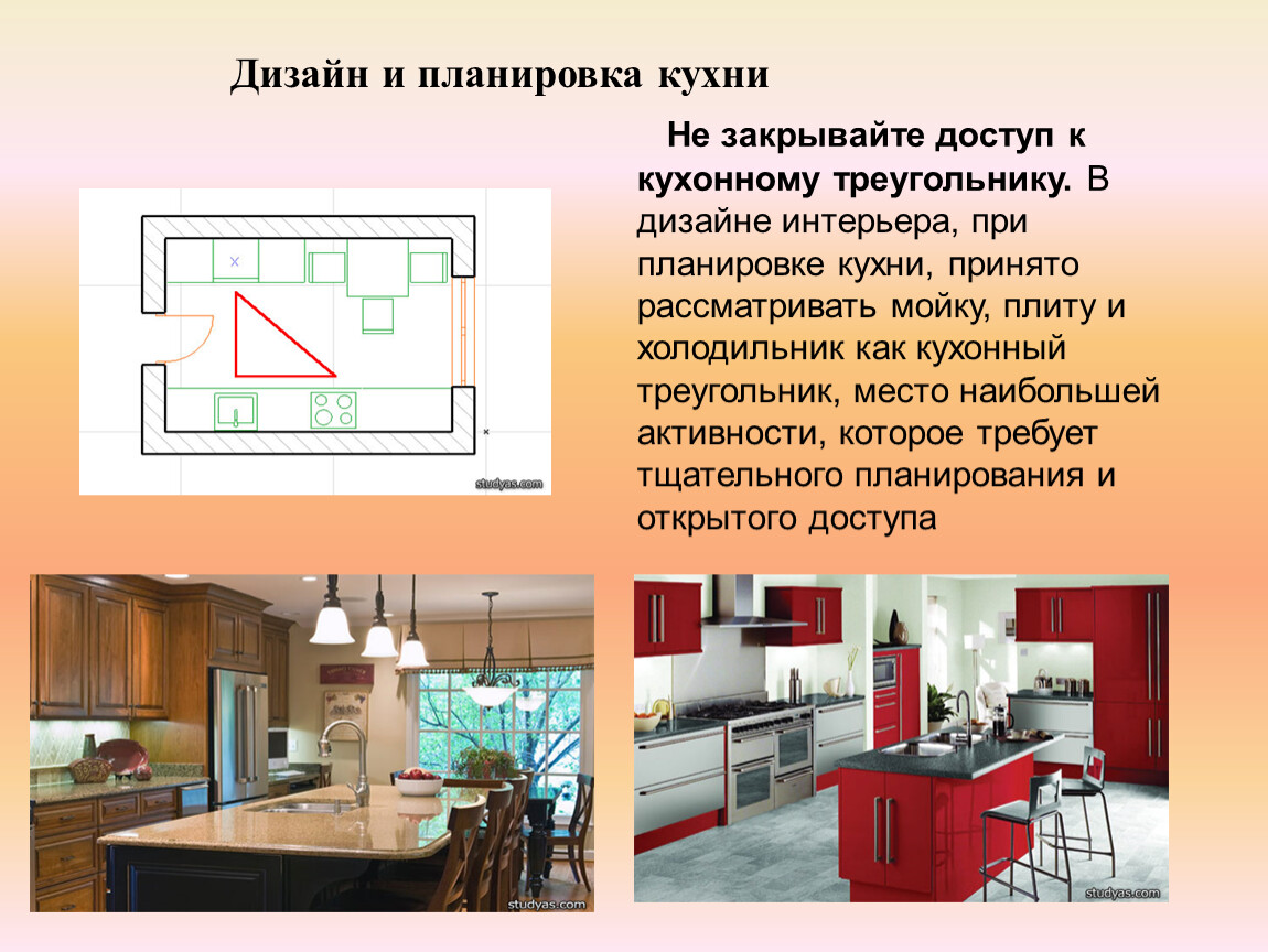 Не закрывайте доступ к кухонному треугольнику. В дизайне интерьера, при планировке кухни, принято рассматривать мойку, плиту и холодильник как кухонный треугольник, место наибольшей активности, которое требует тщательного планирования и открытого доступа