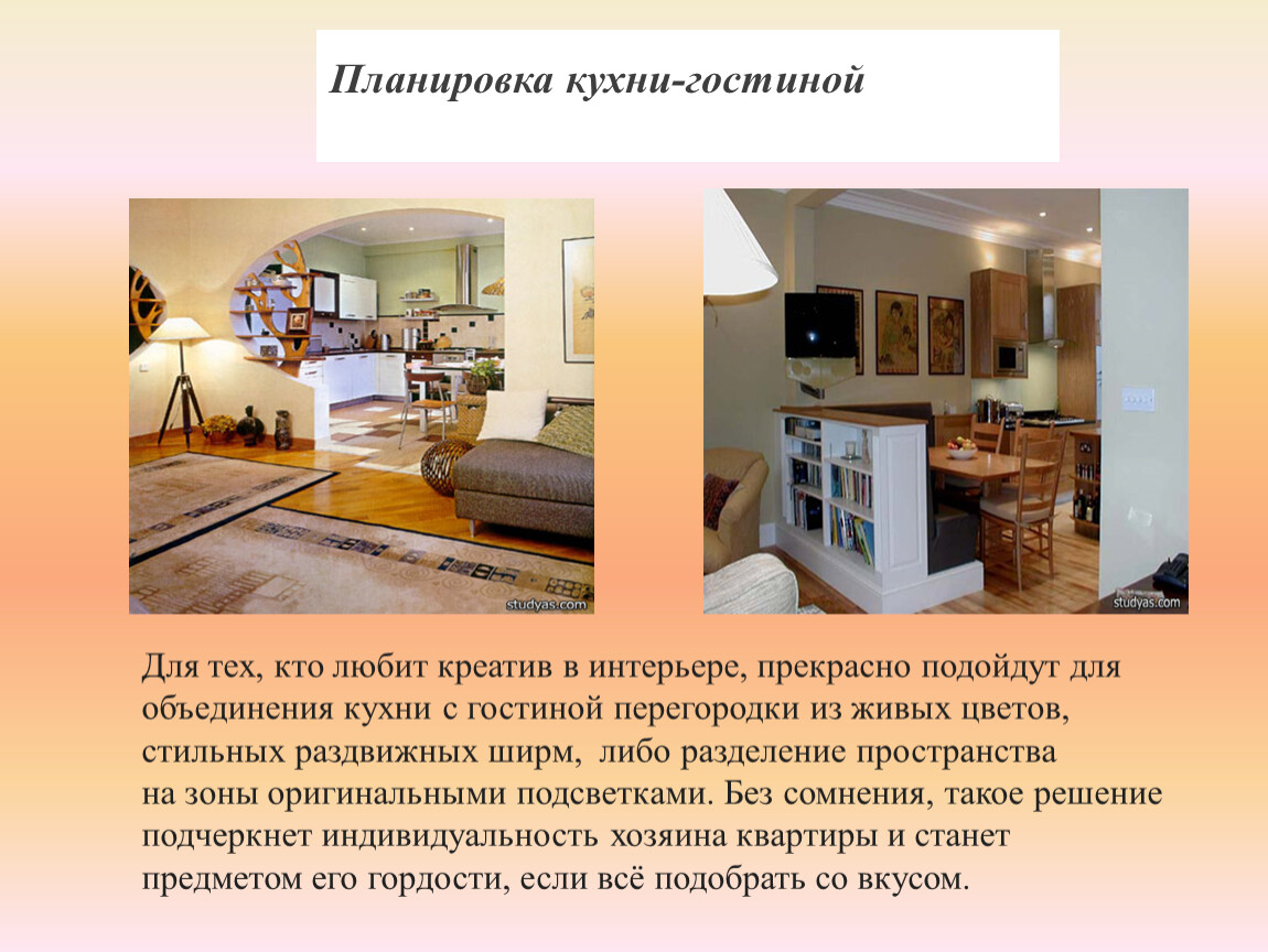 Для тех, кто любит креатив в интерьере, прекрасно подойдут для объединения кухни с гостиной перегородки из живых цветов, стильных раздвижных ширм, либо разделение пространства