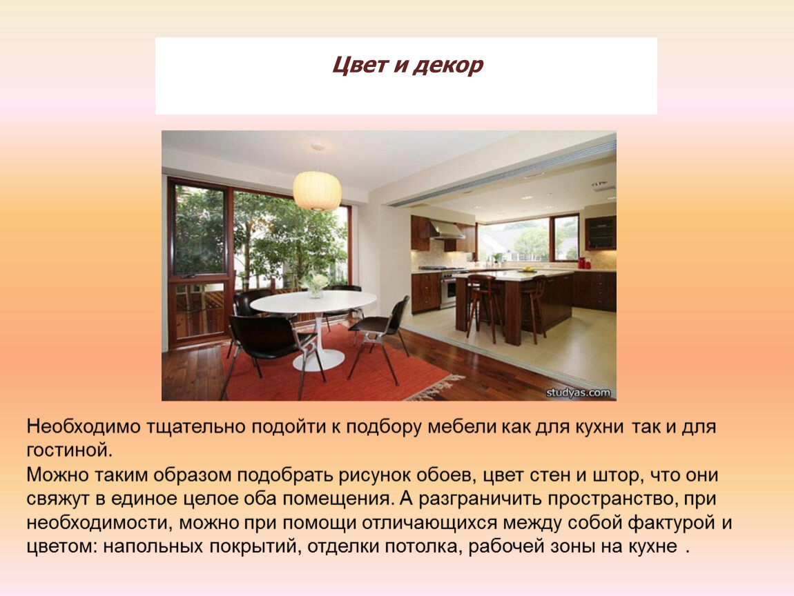 Можно таким образом подобрать рисунок обоев, цвет стен и штор, что они свяжут в единое целое оба помещения. А разграничить пространство, при необходимости, можно при помощи отличающихся между собой фактурой и цветом: напольных покрытий, отделки потолка, рабочей зоны на кухне .