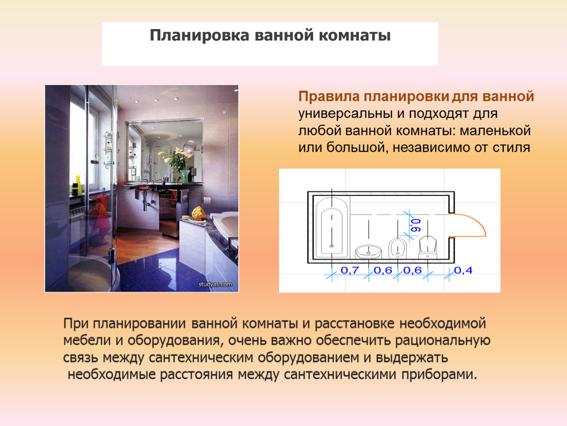 При планировании ванной комнаты и расстановке необходимой мебели и оборудования, очень важно обеспечить рациональную связь между сантехническим оборудованием и выдержать