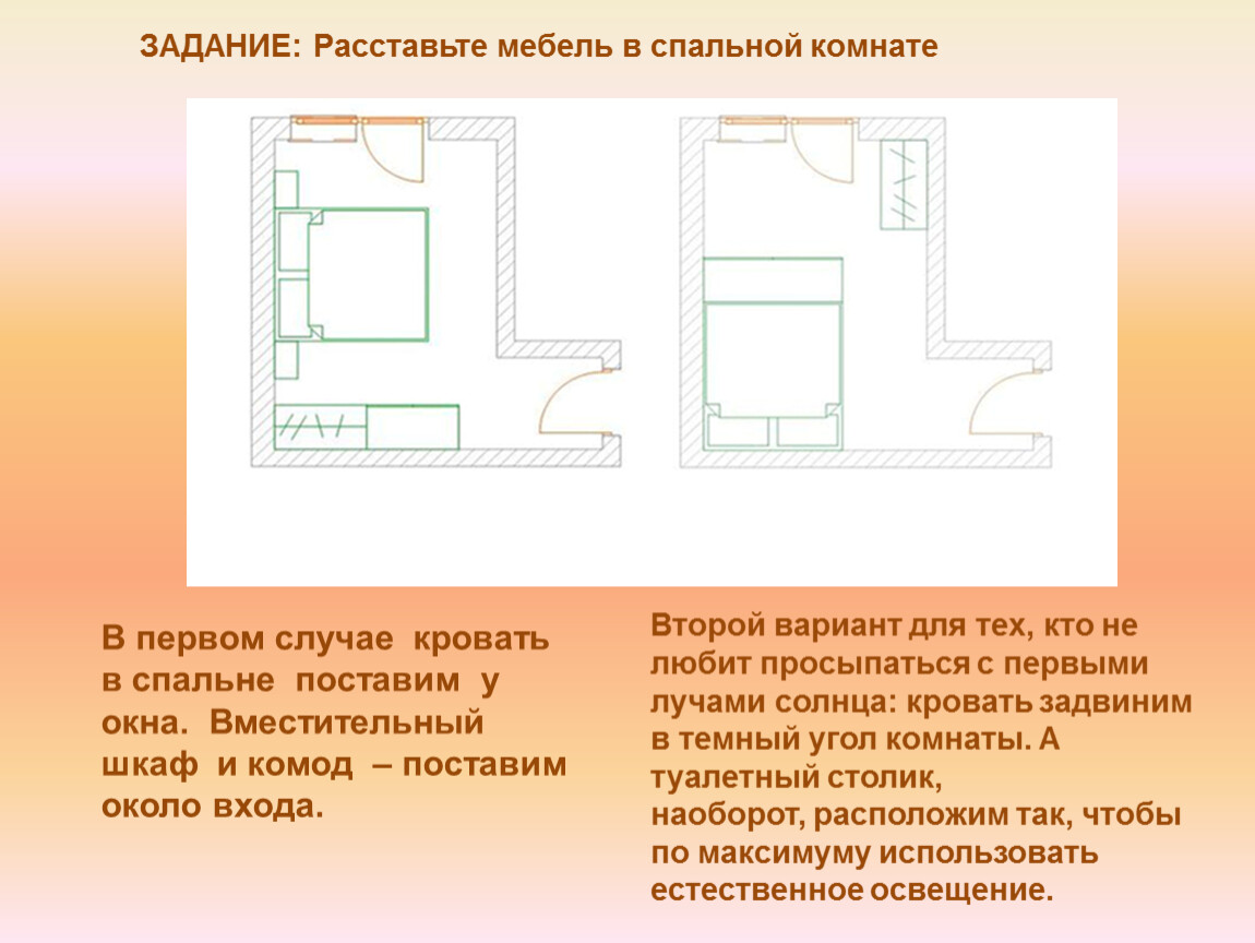 ЗАДАНИЕ: Расставьте мебель в спальной комнате