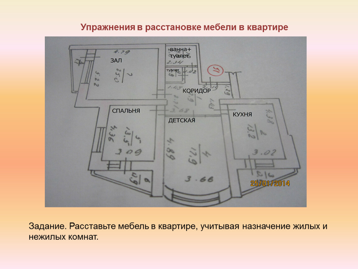 Задание. Расставьте мебель в квартире, учитывая назначение жилых и нежилых комнат.