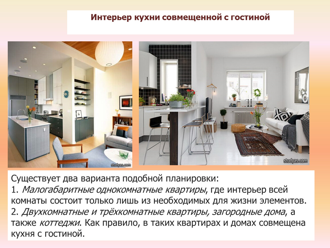 2. Двухкомнатные и трёхкомнатные квартиры, загородные дома, а также коттеджи. Как правило, в таких квартирах и домах совмещена кухня с гостиной.