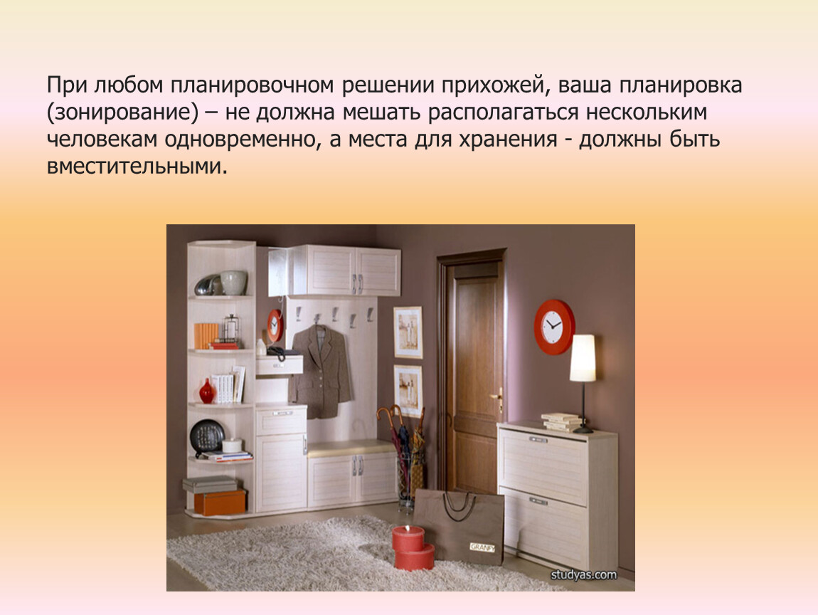 При любом планировочном решении прихожей, ваша планировка (зонирование) – не должна мешать располагаться нескольким человекам одновременно, а места для хранения - должны быть вместительными.