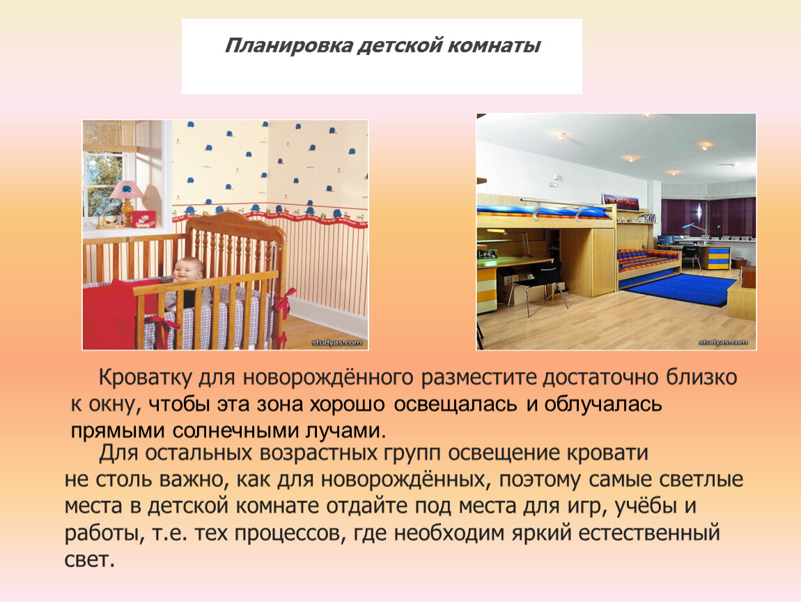 не столь важно, как для новорождённых, поэтому самые светлые места в детской комнате отдайте под места для игр, учёбы и работы, т.е. тех процессов, где необходим яркий естественный свет.