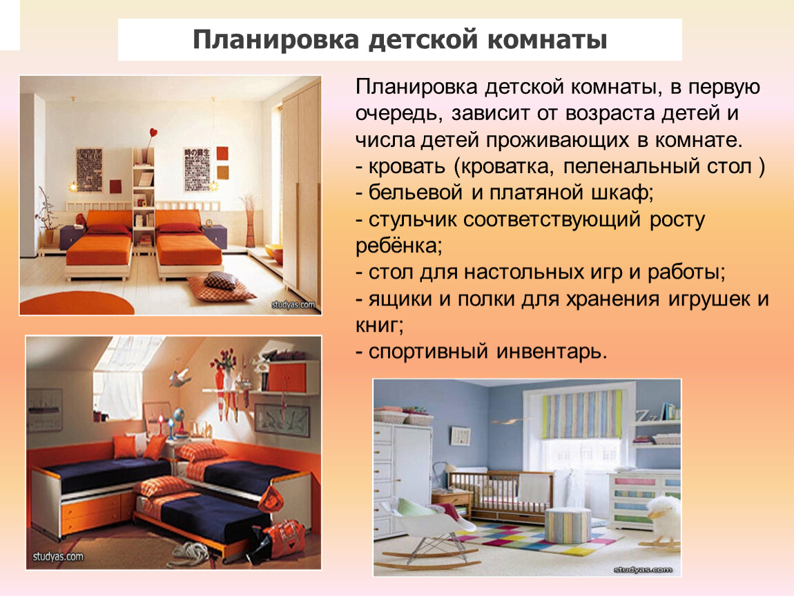 Планировка детской комнаты, в первую очередь, зависит от возраста детей и числа детей проживающих в комнате.