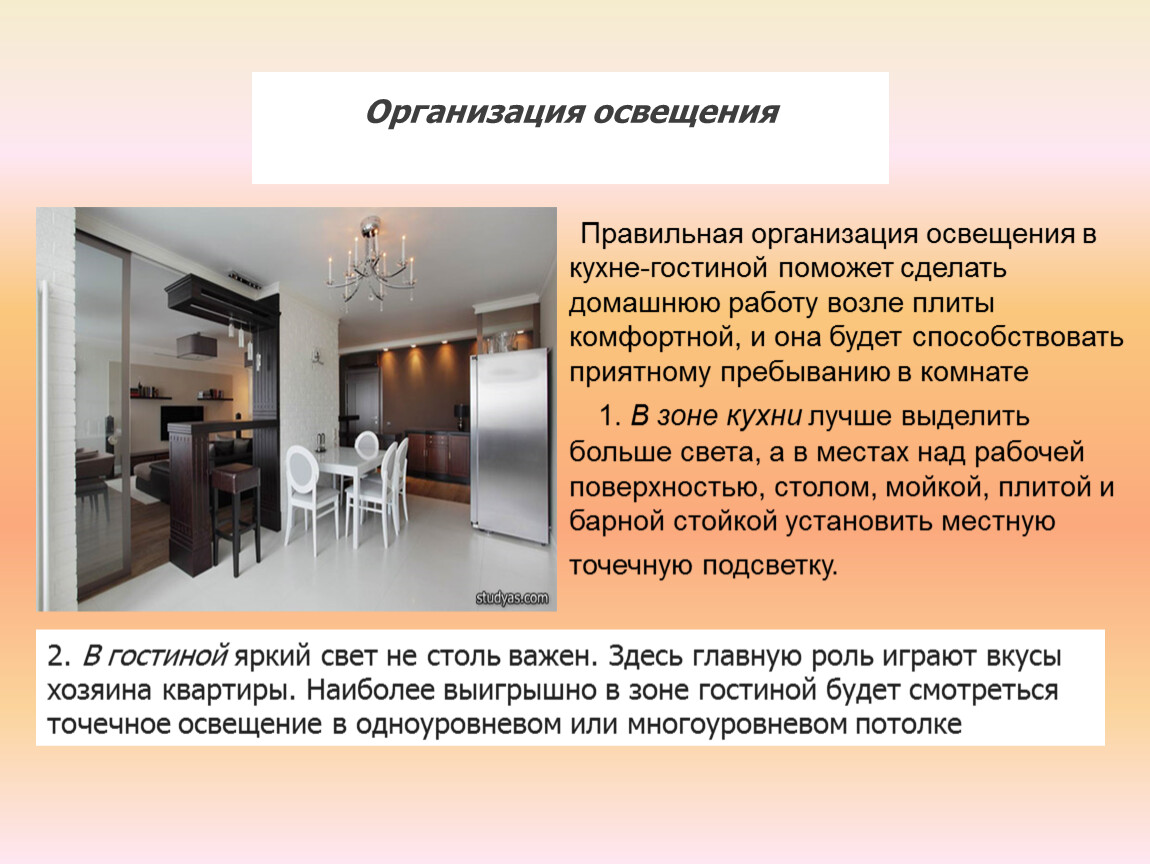 Правильная организация освещения в кухне-гостиной поможет сделать домашнюю работу возле плиты комфортной, и она будет способствовать приятному пребыванию в комнате