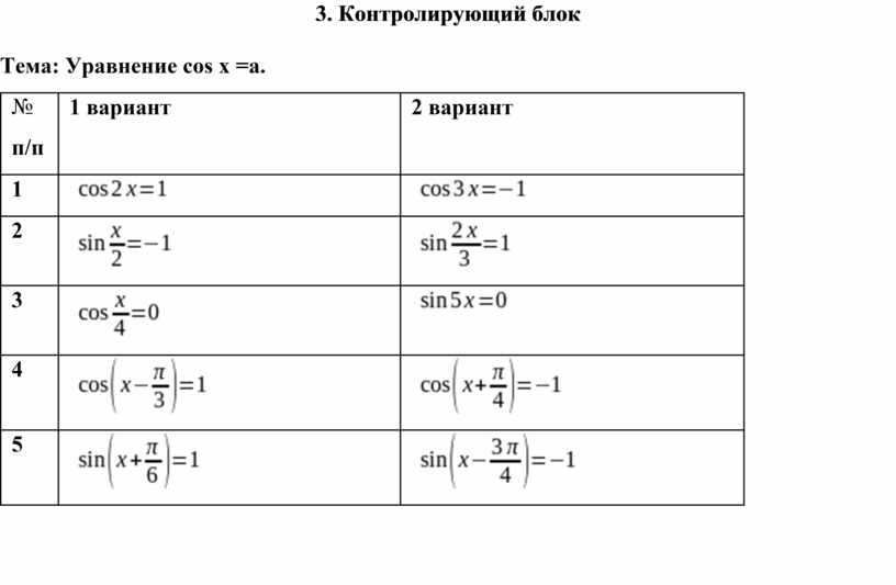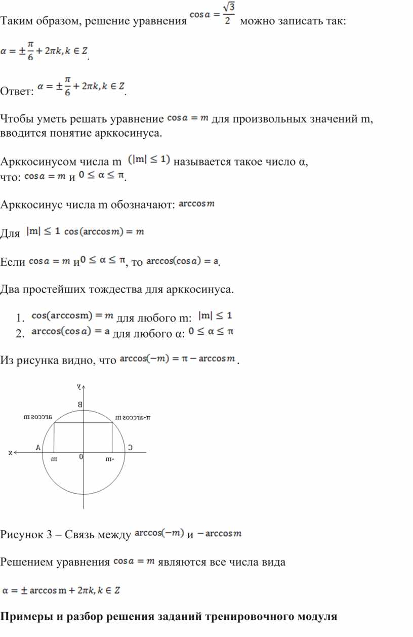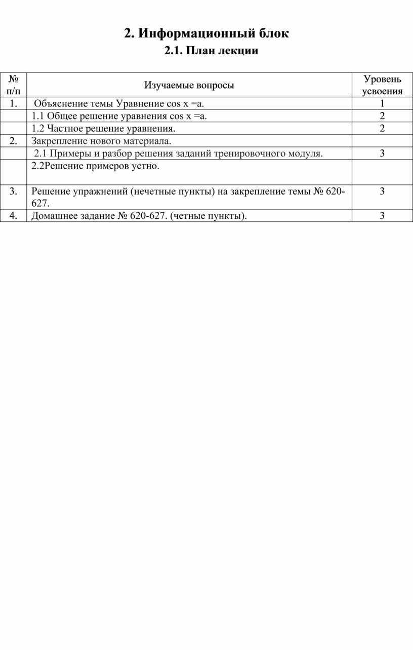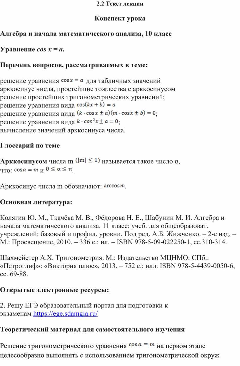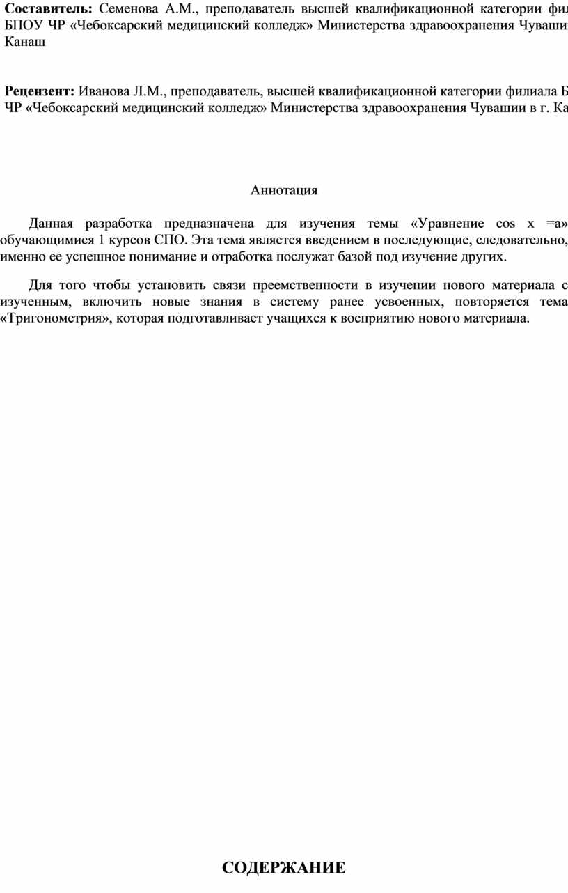 Программный материал данного занятия базируется на знаниях математики. Методическая разработка занятия составлена для проведения теоретических занятий по теме: «Уравнение cos x =a.» –2 часа. В процессе практического занятия студенты закрепляют полученные знания: определения функций, их свойства и графики, преобразования графиков, непрерывные и периодические функции, обратные функции и их графики.