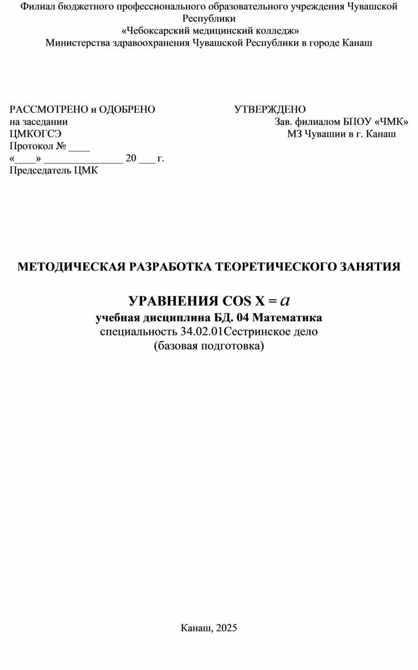 утверждено Зав. филиалом БПОУ «ЧМК» МЗ Чувашии в г. Канаш