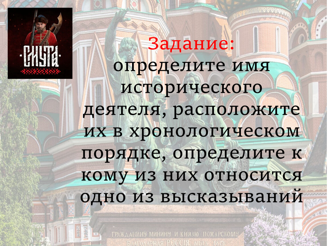 Задание:определите имя исторического деятеля, расположите их в хронологическом порядке, определите к кому из них относится одно из высказываний
