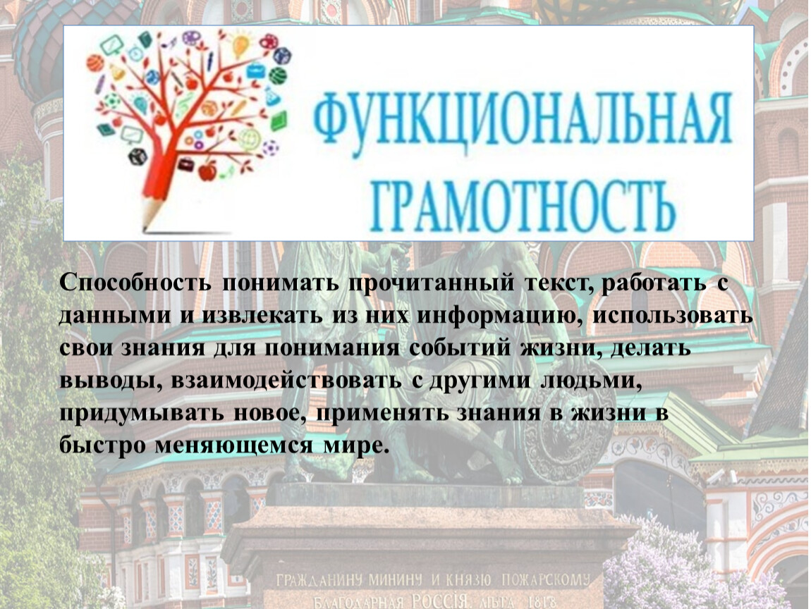 Способность понимать прочитанный текст, работать с данными и извлекать из них информацию, использовать свои знания для понимания событий жизни, делать выводы, взаимодействовать с другими людьми, придумывать новое, применять знания в жизни в быстро меняющемся мире.
