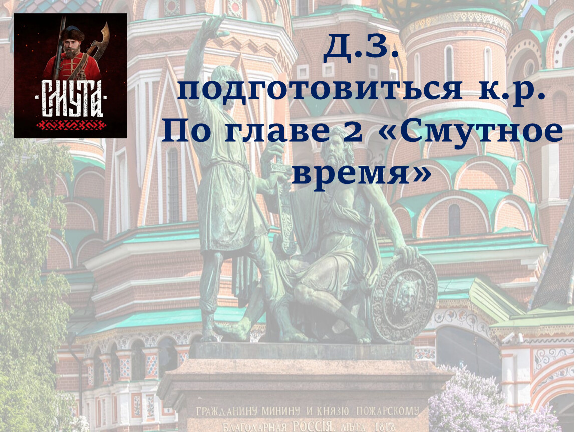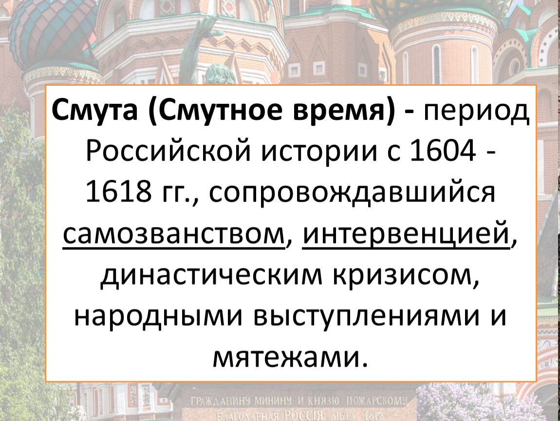 Смута (Смутное время) - период Российской истории с 1604 -1618 гг., сопровождавшийся самозванством, интервенцией, династическим кризисом, народными выступлениями и мятежами.