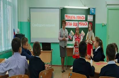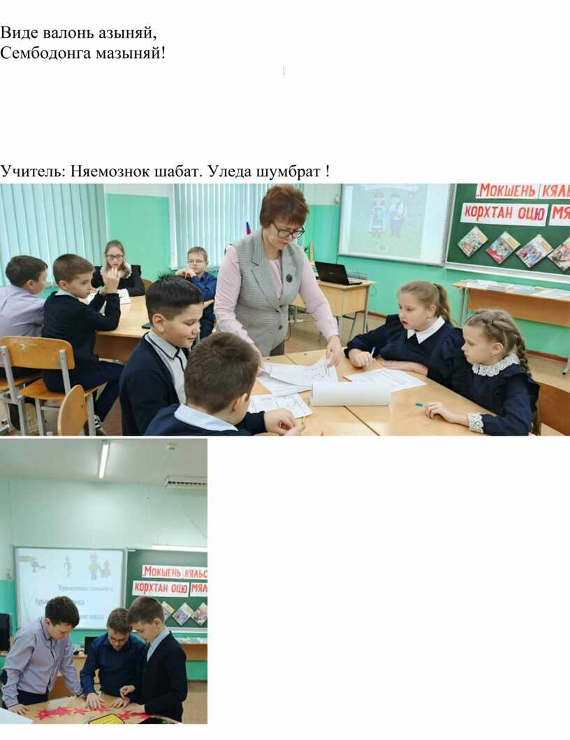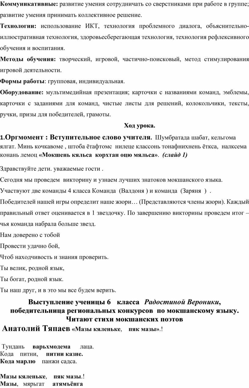 1.Оргмомент : Вступительное слово учителя. Шумбратада шабат, кельгома ялгат. Минь кочкавоме , штоба ётафтомс нилеце классонь тонафнихнень ёткса, налксема конань лемоц «Мокшень кяльса корхтан оцю мяльса». (слайд 1)