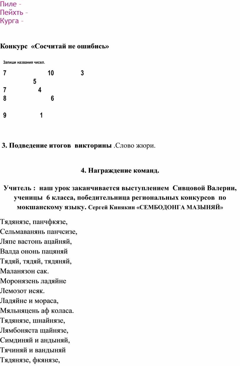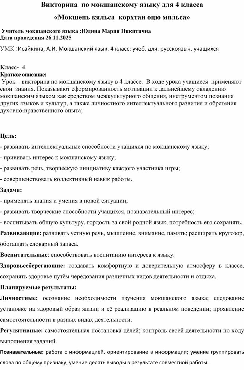 Урок – викторина по мокшанскому языку в 4 классе. В ходе урока учащиеся применяют свои знания. Показывают сформированность мотивации к дальнейшему овладению мокшанским языком как средством межкультурного общения, инструментом познания других языков и культур, а также личностного интеллектуального развития и обретения духовно-нравственного опыта;