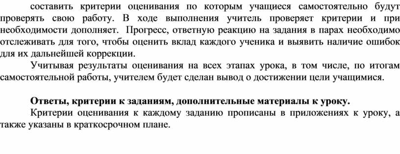 Критерии оценивания к каждому заданию прописаны в приложениях к уроку, а также указаны в краткосрочном плане.