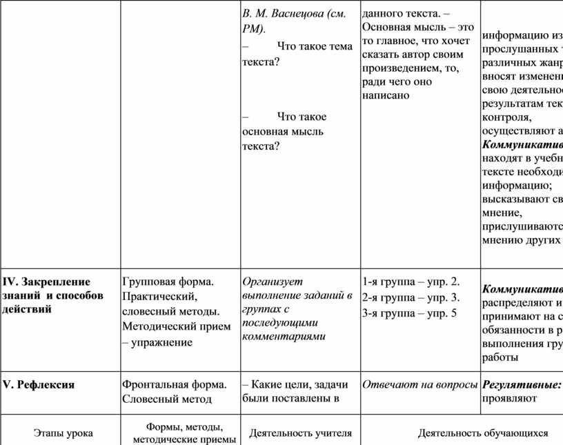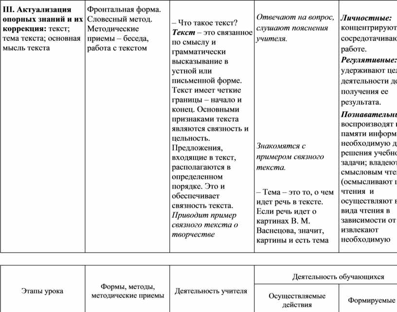 III. Актуализация опорных знаний и их коррекция: текст; тема текста; основная мысль текста |
